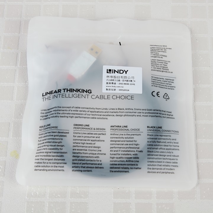 ▲今天的主角:「LINDY 林帝 USB3.0 Type-A / 公 轉 Micro-B 公 1M 高速傳輸線」,其包裝風格同稍早分享過的其他品項設計如出一轍。林帝 LINDY是德國品牌,原廠原裝包裝多以袋裝為主,英文說明文字,輔以中文吊牌標示。正面多國語言標示的 USB3.0 傳輸線,有不同長度可供選擇。此回分享的是代號 No.36657 1M長度的線材。