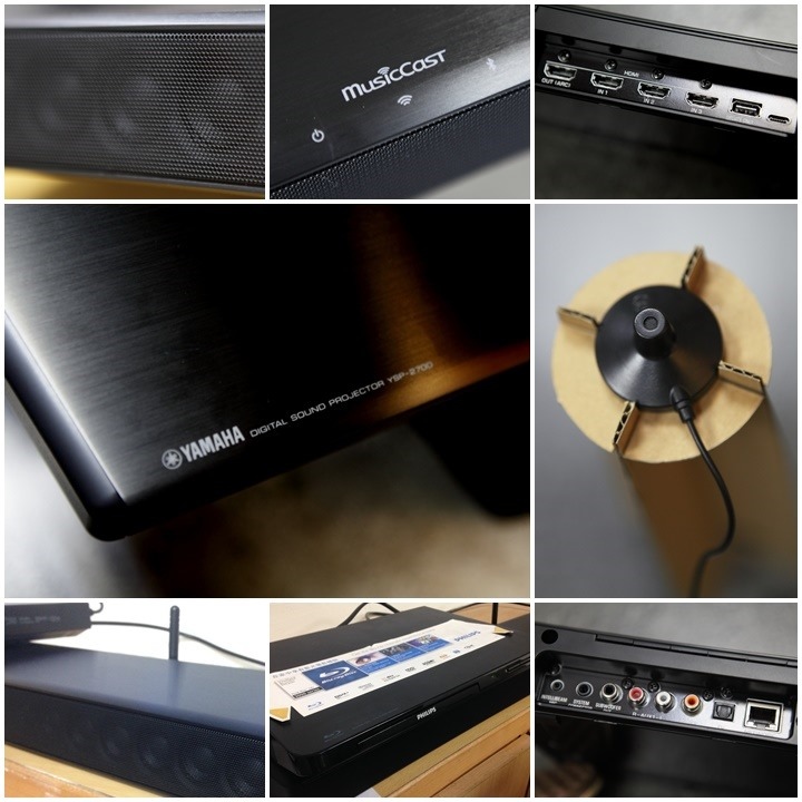 可以透過 背面的訊號輸入、輸出接頭,最左邊是 INTELLIBEAM 麥克風連結插孔,由左至右依序兩種重低音輸出,AUX 立體聲輸出、同軸、數位光纖輸入、RJ-45 網路孔。HDMI一組 ARC 輸出、三組輸入,支援 HDR、HDCP2.2,USB 孔僅供韌體升級專用,一般狀況無法使用。機殼背後明顯標示:支援 INTELLIBEAM 麥克風插孔、CINEMA DSP、dts HD、DOLBY AUDIO、Bluetooth、WiFi、HDMI 等規格。看您的設備有哪個音源輸出介面,就可以接到 YAMAHA YSP-2700 上。