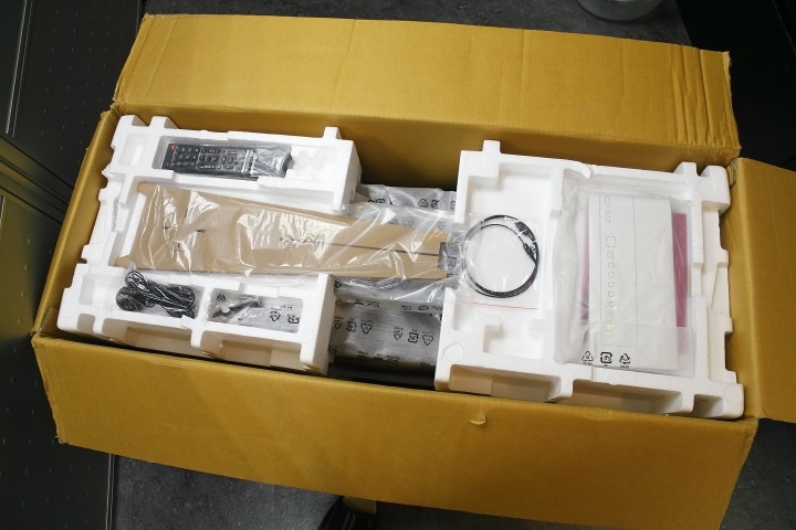 ▲包裝開箱,滿滿的內容物,首先映入眼簾的有YSP-2700 Soundbar本體跟重低音喇叭本體、遙控器、說明書及硬紙板麥克風架、麥克風、光纖線等等。