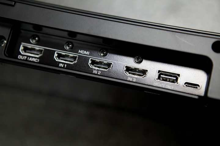 ▲背面的訊號輸入、輸出接頭,最左邊是 INTELLIBEAM 麥克風連結插孔,由左至右依序兩種重低音輸出,AUX 立體聲輸出、同軸、數位光纖輸入、RJ-45 網路孔。HDMI一組 ARC 輸出、三組輸入,支援 HDR、HDCP2.2,USB 孔僅供韌體升級專用,一般狀況無法使用。機殼背後明顯標示:支援 INTELLIBEAM 麥克風插孔、CINEMA DSP、dts HD、DOLBY AUDIO、Bluetooth、WiFi、HDMI 等規格。